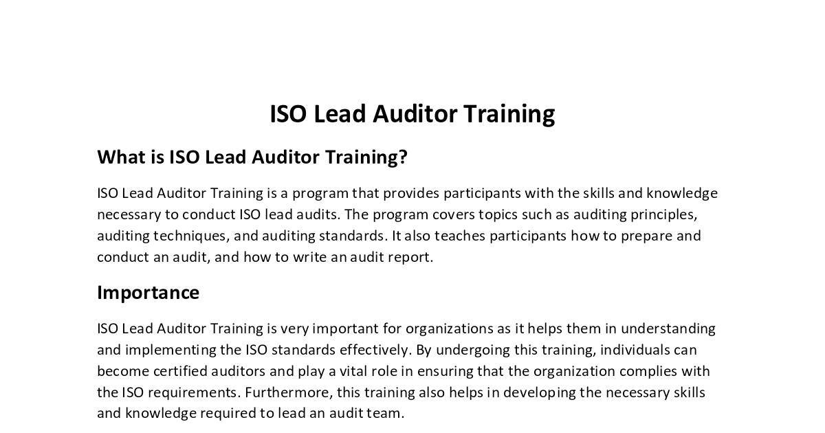 ISO Lead Auditor Training is a program that provides participants with the skills and knowledge