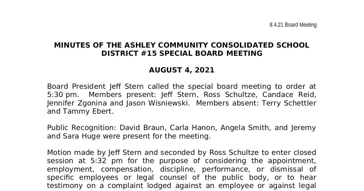 MINUTES OF THE ASHLEY COMMUNITY CONSOLIDATED SCHOOL
