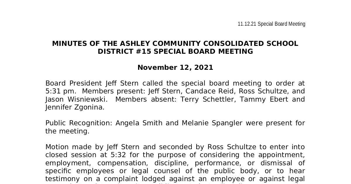 MINUTES OF THE ASHLEY COMMUNITY CONSOLIDATED SCHOOL