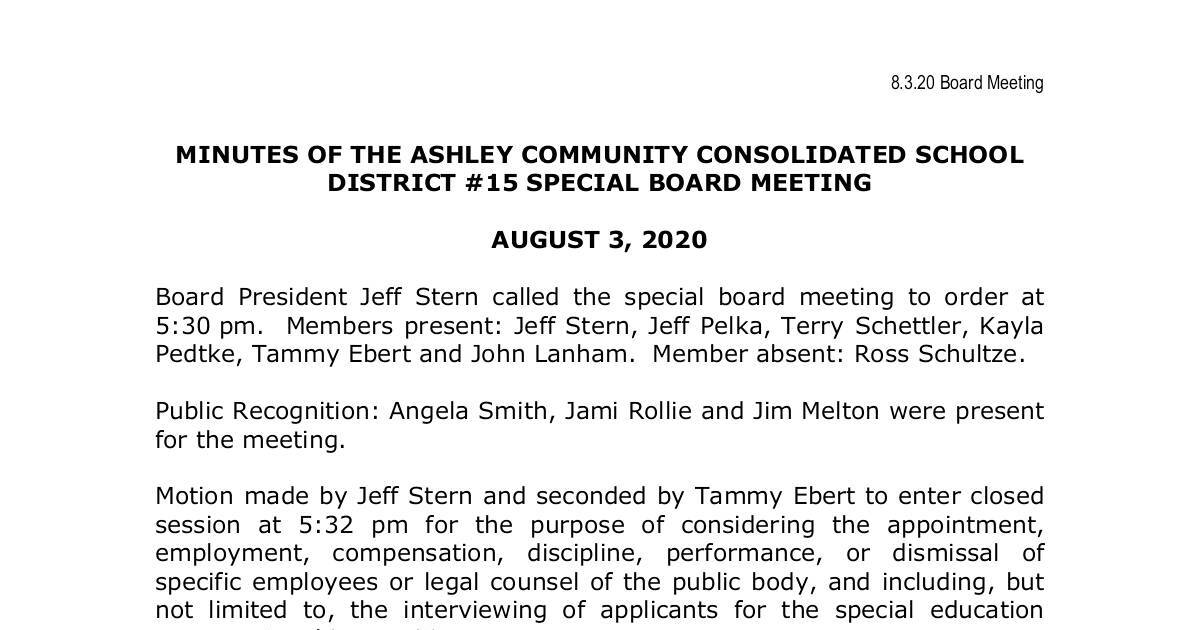 MINUTES OF THE ASHLEY COMMUNITY CONSOLIDATED SCHOOL