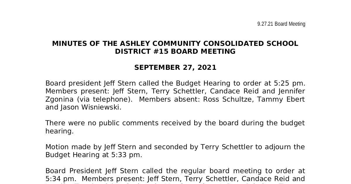 MINUTES OF THE ASHLEY COMMUNITY CONSOLIDATED SCHOOL