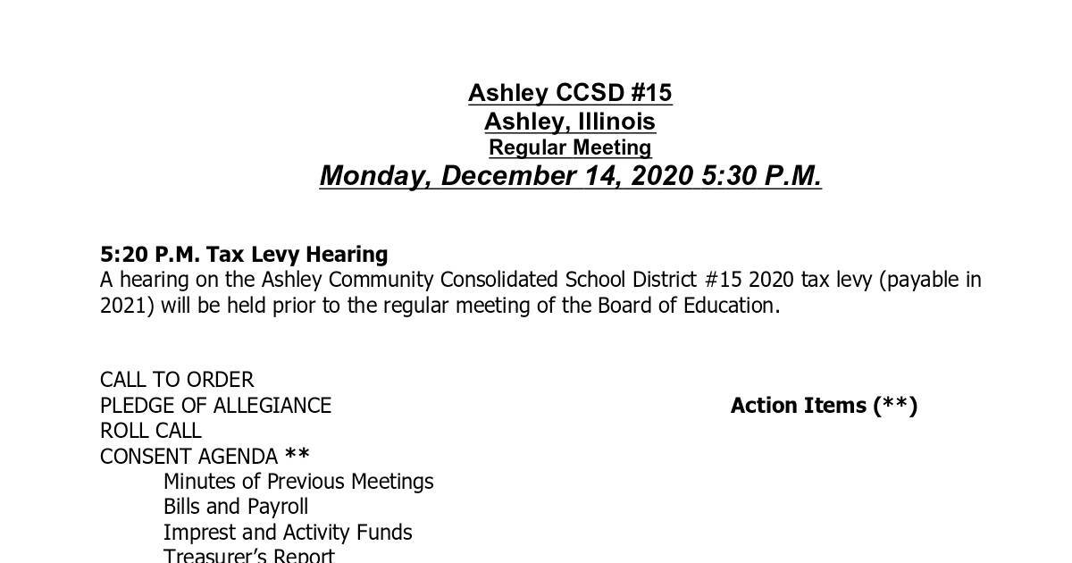 A hearing on the Ashley Community Consolidated School District #15 2020 tax levy (payable in