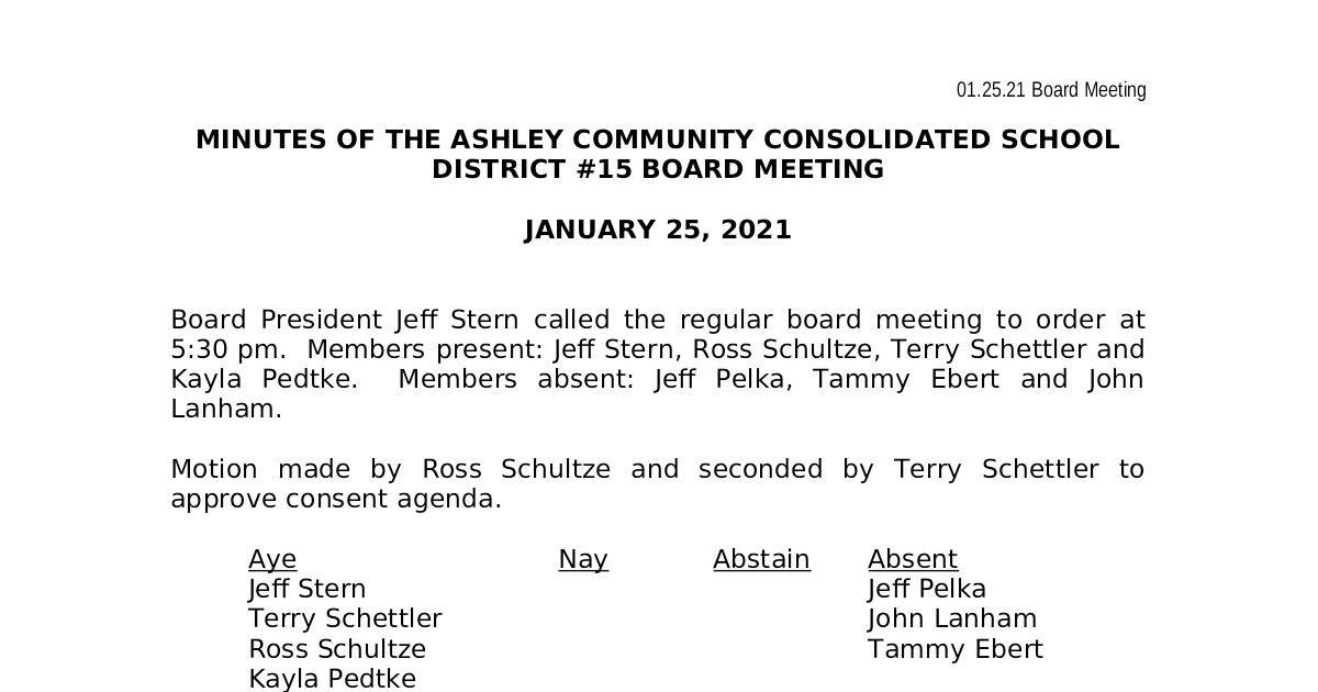 MINUTES OF THE ASHLEY COMMUNITY CONSOLIDATED SCHOOL
