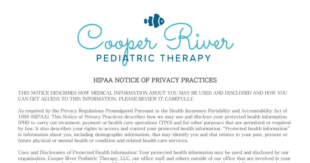 organization, Cooper River Pediatric Therapy, LLC, our office staff and others outside of our office that are involved in your