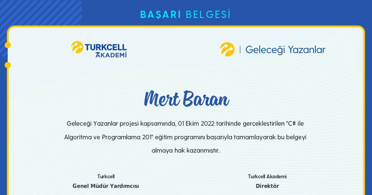 Algoritma ve Programlama 201" eğitim programını başarıyla tamamlayarak bu belgeyi