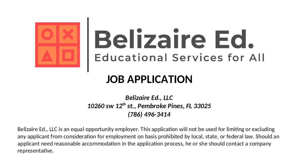 Belizaire Ed., LLC is an equal opportunity employer. This applicaon will not be used for liming or excluding