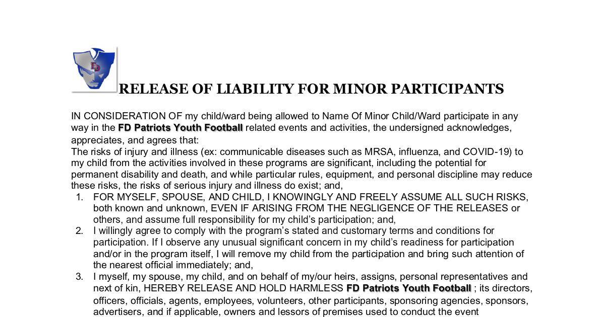 way in the FD Patriots Youth Football related events and activities, the undersigned acknowledges,