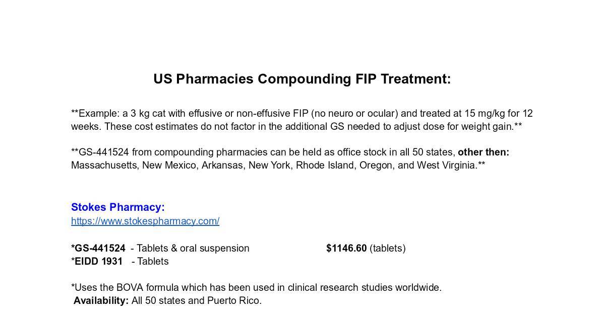**GS-441524 from compounding pharmacies can be held as office stock in all 50 states, other then: