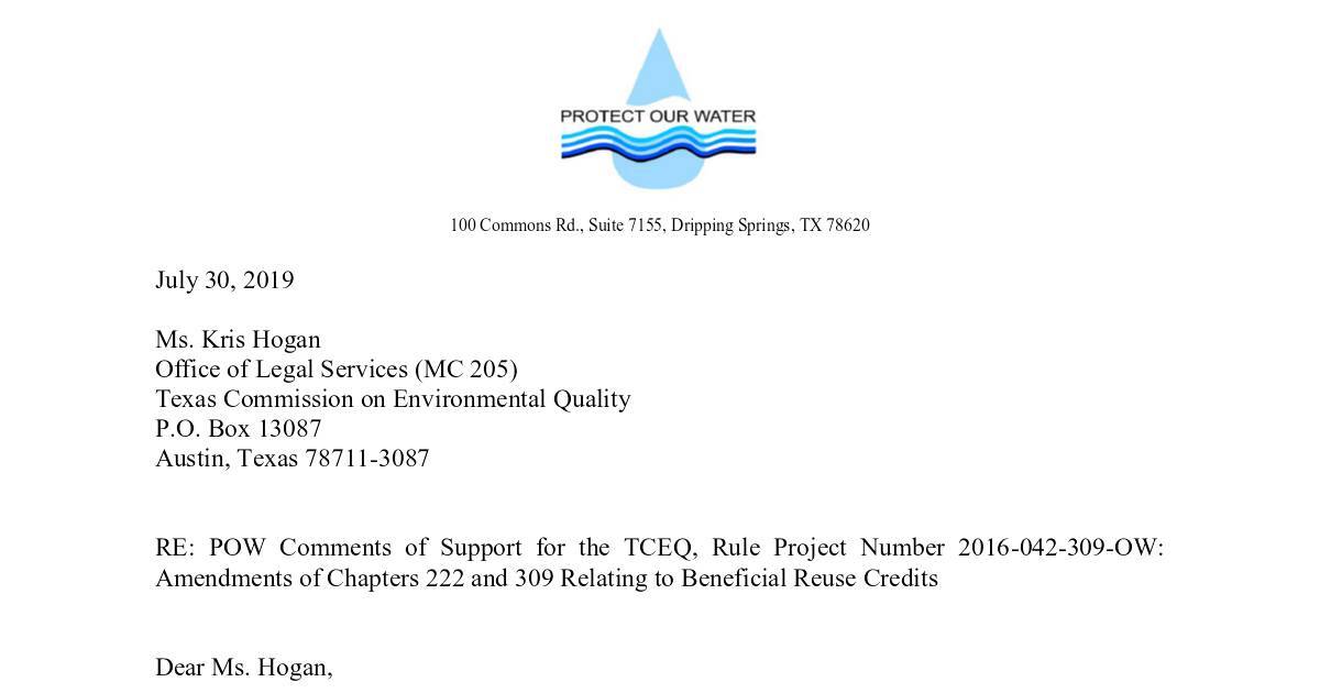 Protect Our Water (POW) requests that TCEQ adopt proposed effluent discharge rule
