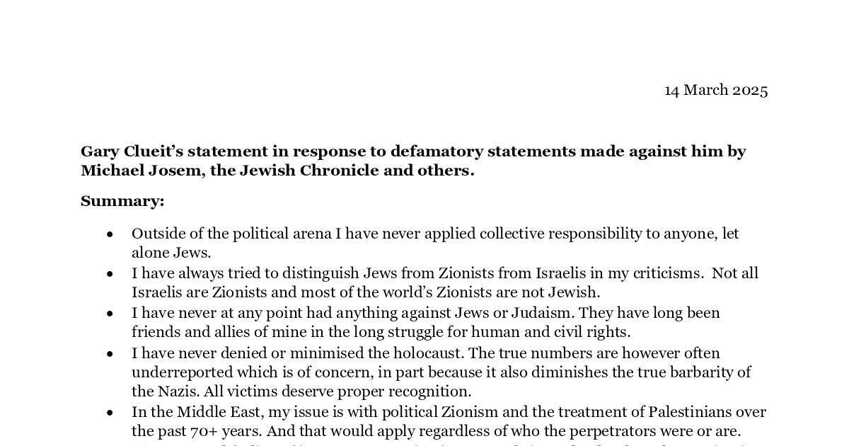 Gary Clueit’s statement in response to defamatory statements made against him by