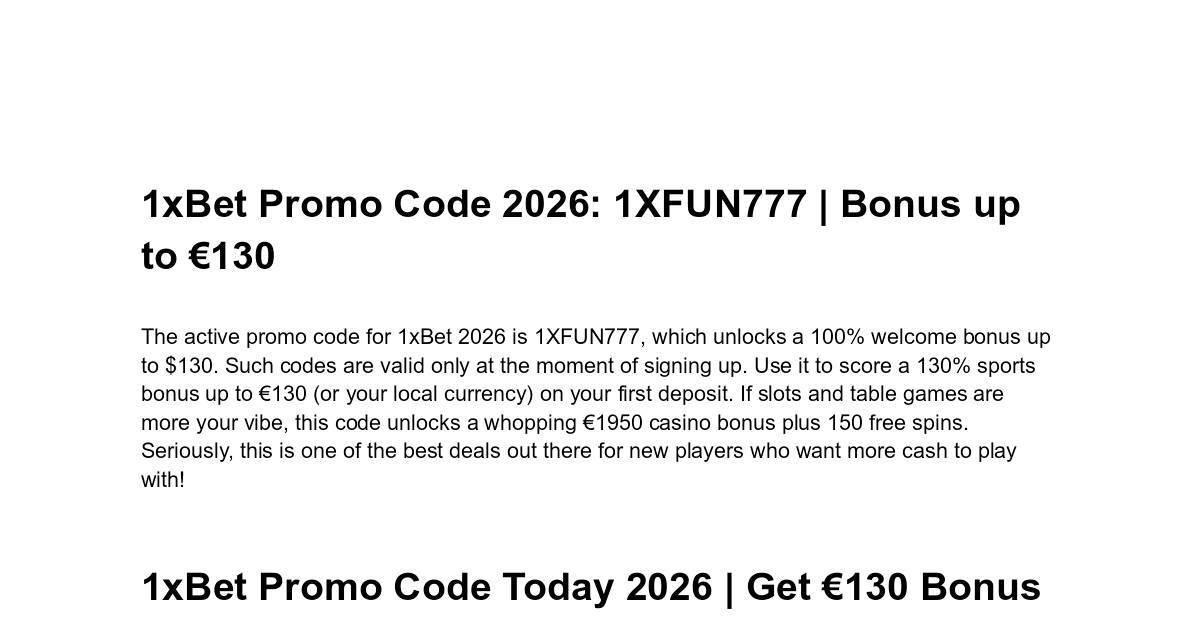 The active promo code for 1xBet 2026 is 1XFUN777, which unlocks a 100% welcome bonus up