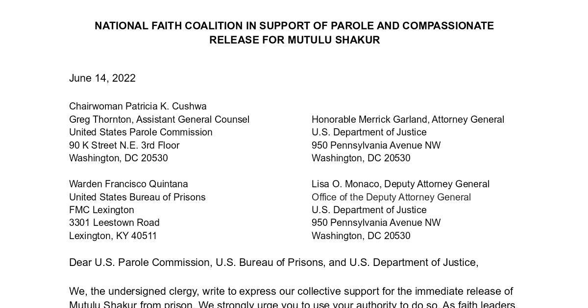 Mutulu Shakur from prison. We strongly urge you to use your authority to do so. As faith leaders,