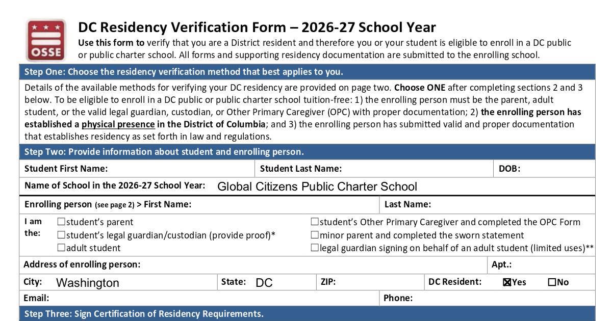 Use this form to verify that you are a District resident and therefore you or your student is eligible to enroll in a DC public