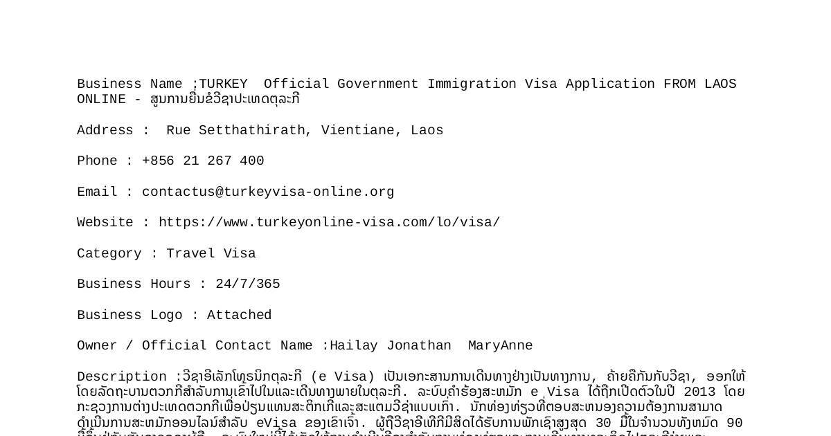 Business Name :TURKEY Official Government Immigration Visa Application FROM LAOS