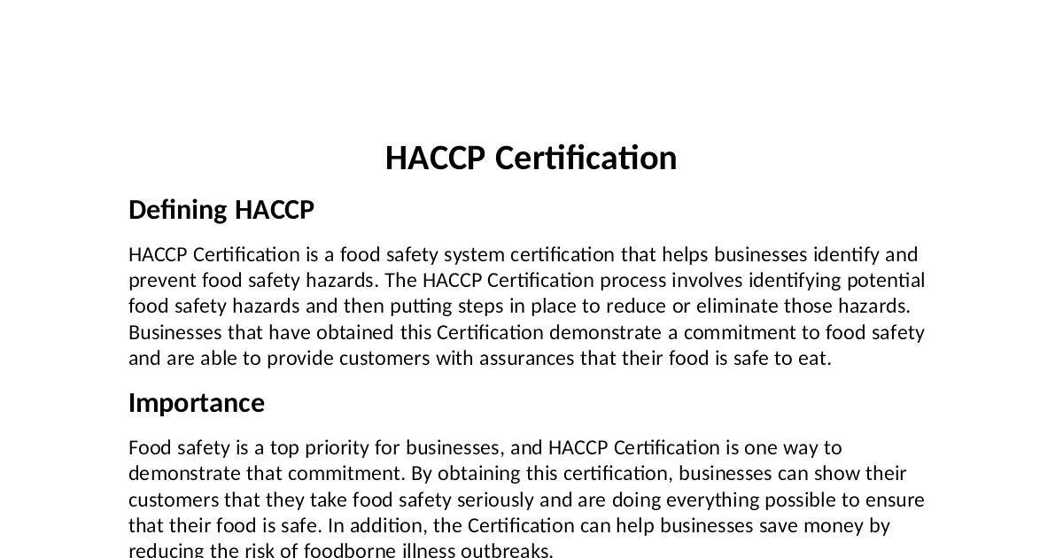To obtain a HACCP Cercate, businesses must rst implement a HACCP Plan that meets