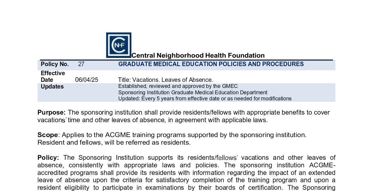 absence, consistently with appropriate laws and policies. The sponsoring institution ACGME-