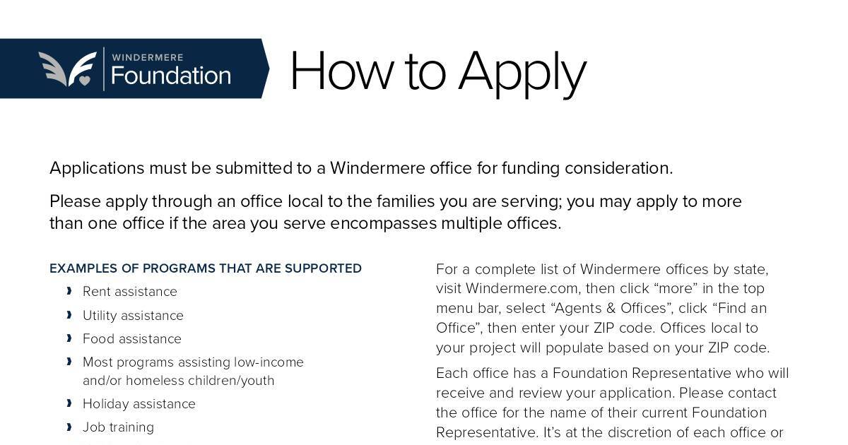 The Windermere Foundation is a 501(c)(3) nonprofit organization created by Windermere Real Estate for the purpose