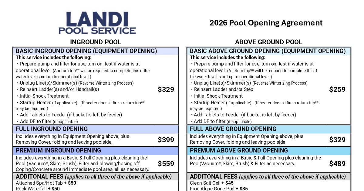 Please return agreement to Landi Pool Service either by mail, email, text or fax.