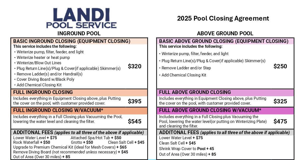 Please return agreement to Landi Pool Service either by mail, email, text, fax.