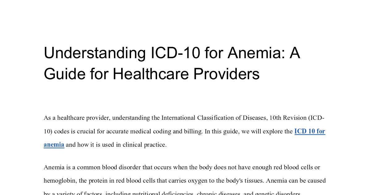 The ICD-10 code for anemia is D64.9, which falls under the Diseases of the Blood and Blood-Forming