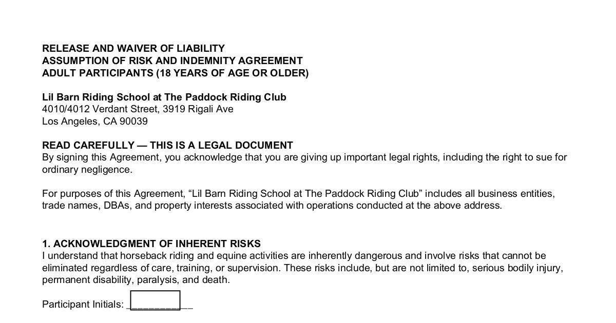 understand that risks exist from footing, fences, gates, barns, trailers, arenas, trails, vehicles, and other participants.