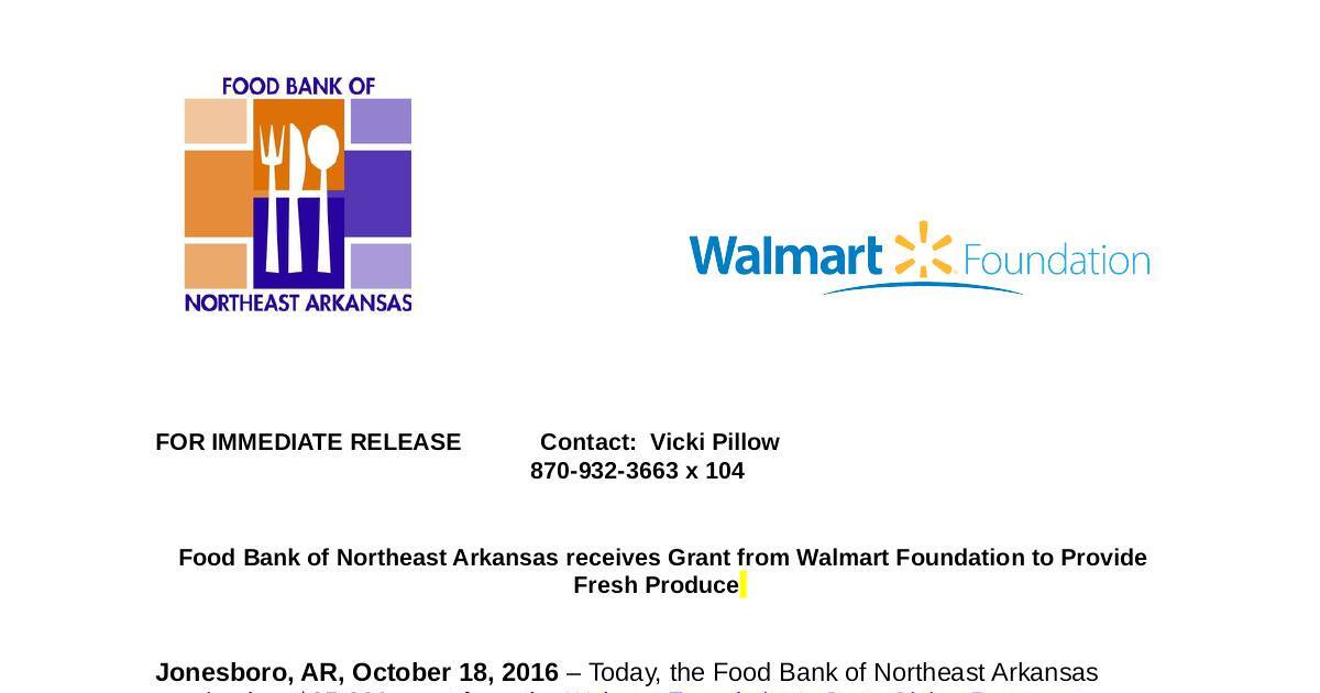 Jonesboro, AR, October 18, 2016 – Today, the Food Bank of Northeast Arkansas