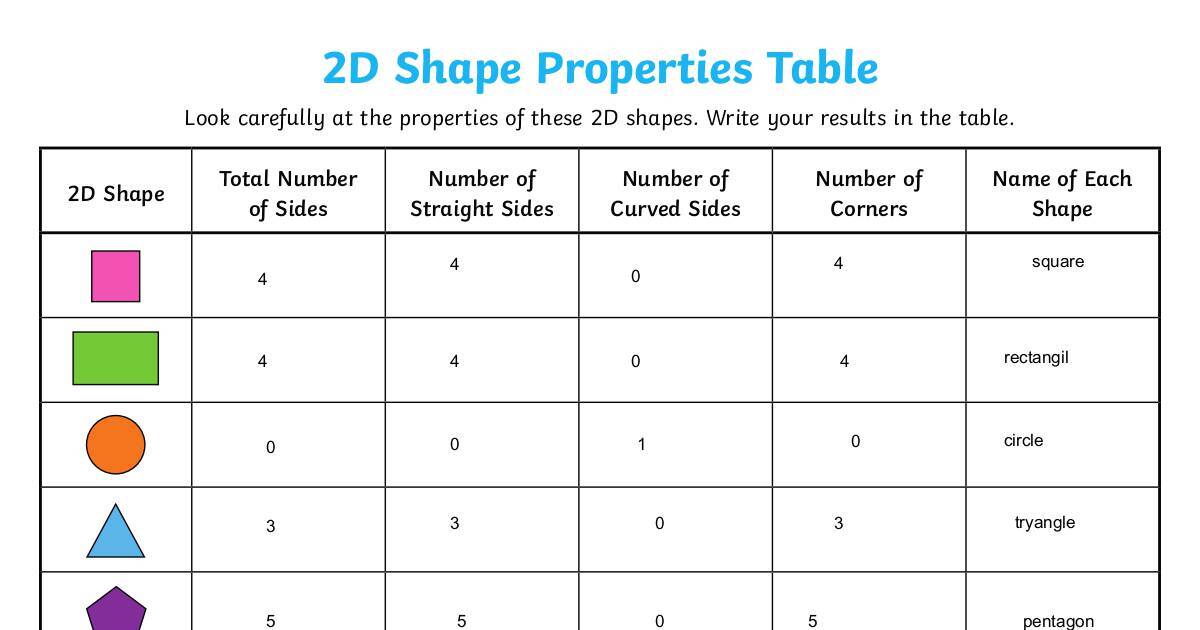Look carefully at the properties of these 2D shapes. Write your results in the table.