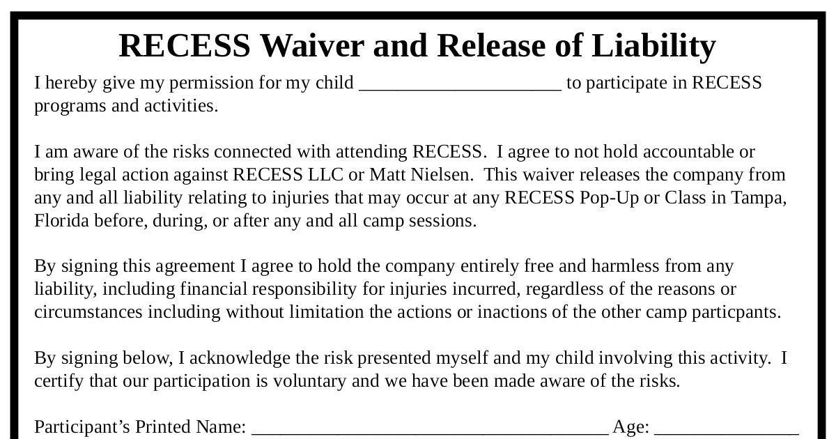 any and all liability relating to injuries that may occur at any RECESS Pop-Up or Class in Tampa,
