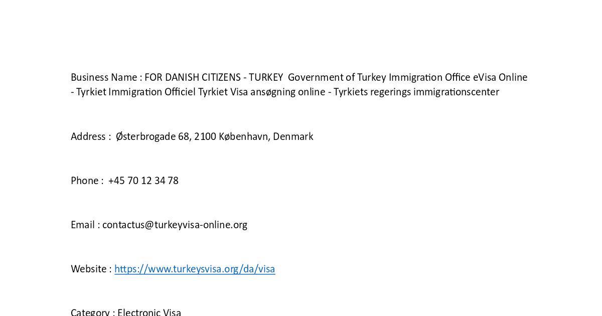 Business Name : FOR DANISH CITIZENS - TURKEY Government of Turkey Immigraon Oce eVisa Online