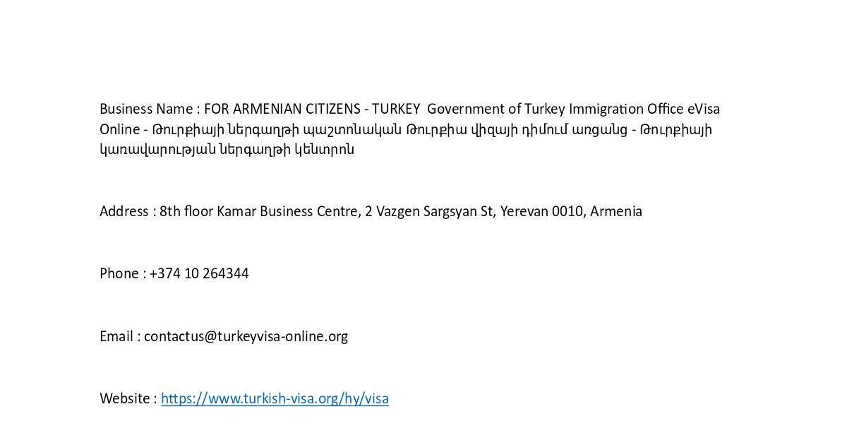 Business Name : FOR ARMENIAN CITIZENS - TURKEY Government of Turkey Immigraon Oce eVisa