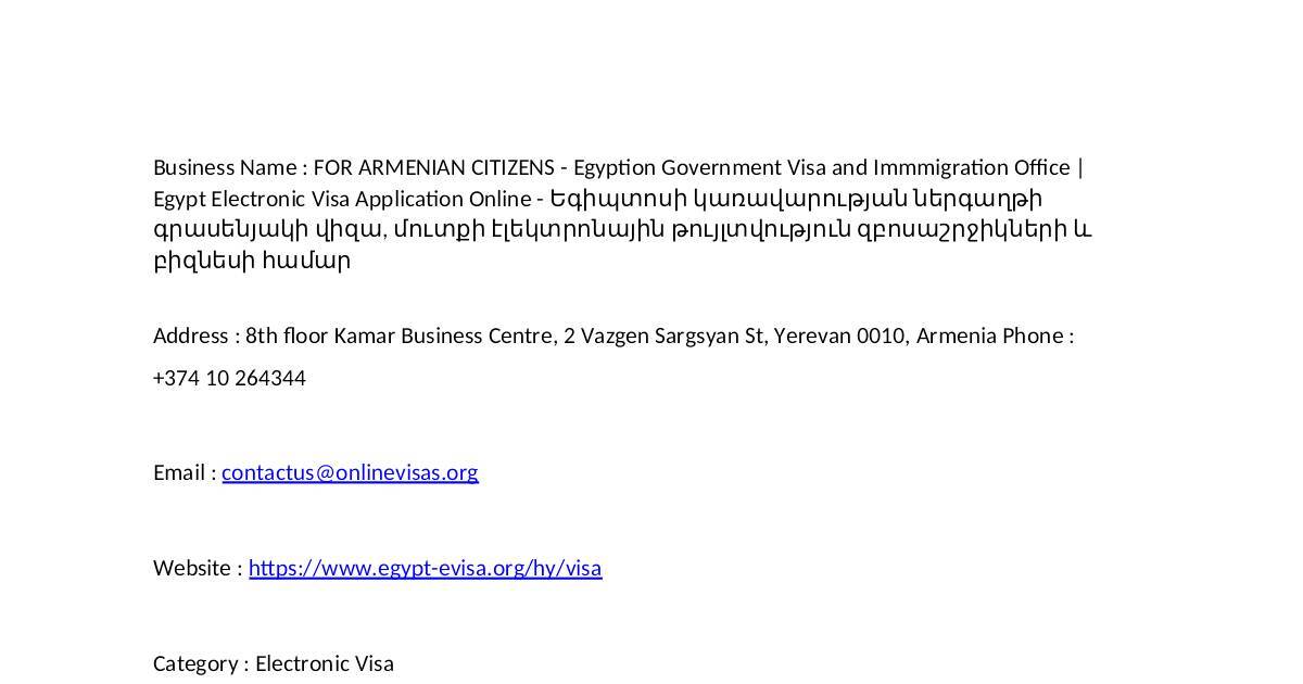 Business Name : FOR ARMENIAN CITIZENS - Egypon Government Visa and Immmigraon O#ce |