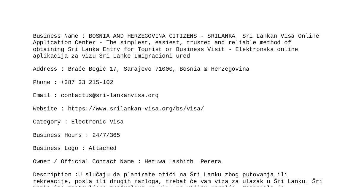 Business Name : BOSNIA AND HERZEGOVINA CITIZENS - SRILANKA Sri Lankan Visa Online
