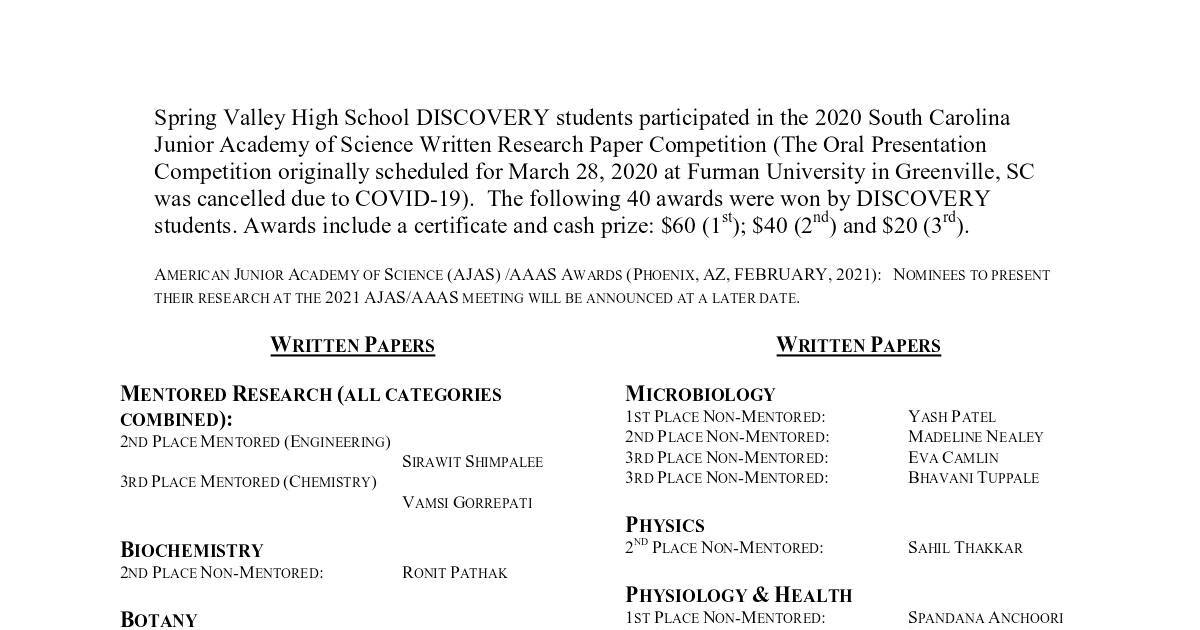 Spring Valley High School DISCOVERY students participated in the 2020 South Carolina