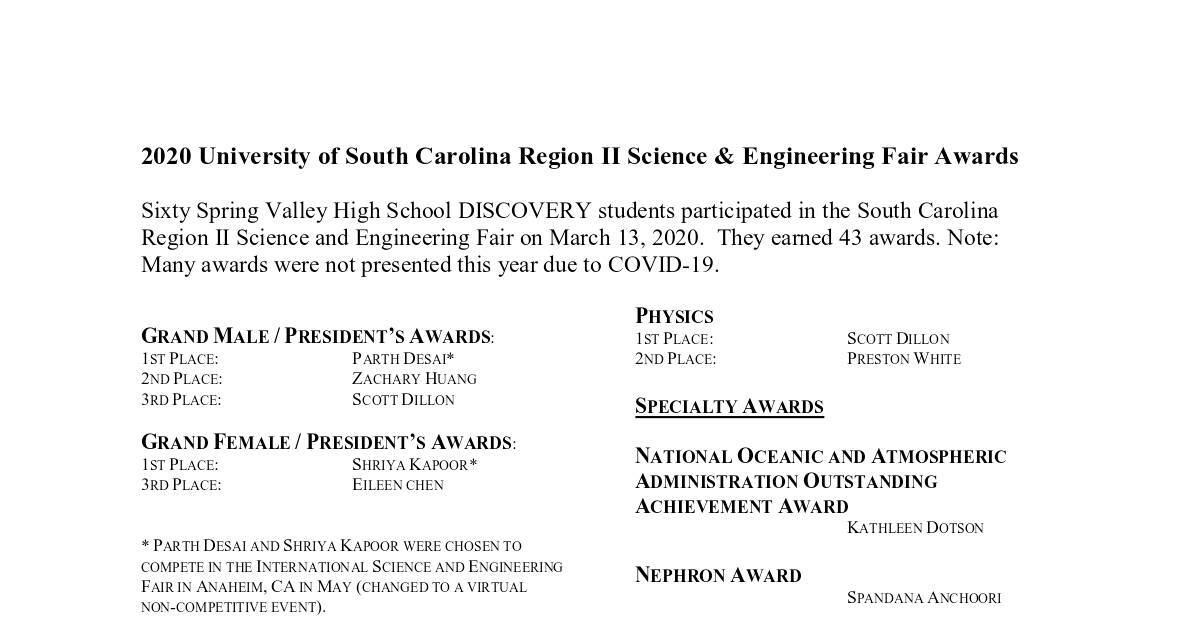 2020 University of South Carolina Region II Science & Engineering Fair Awards