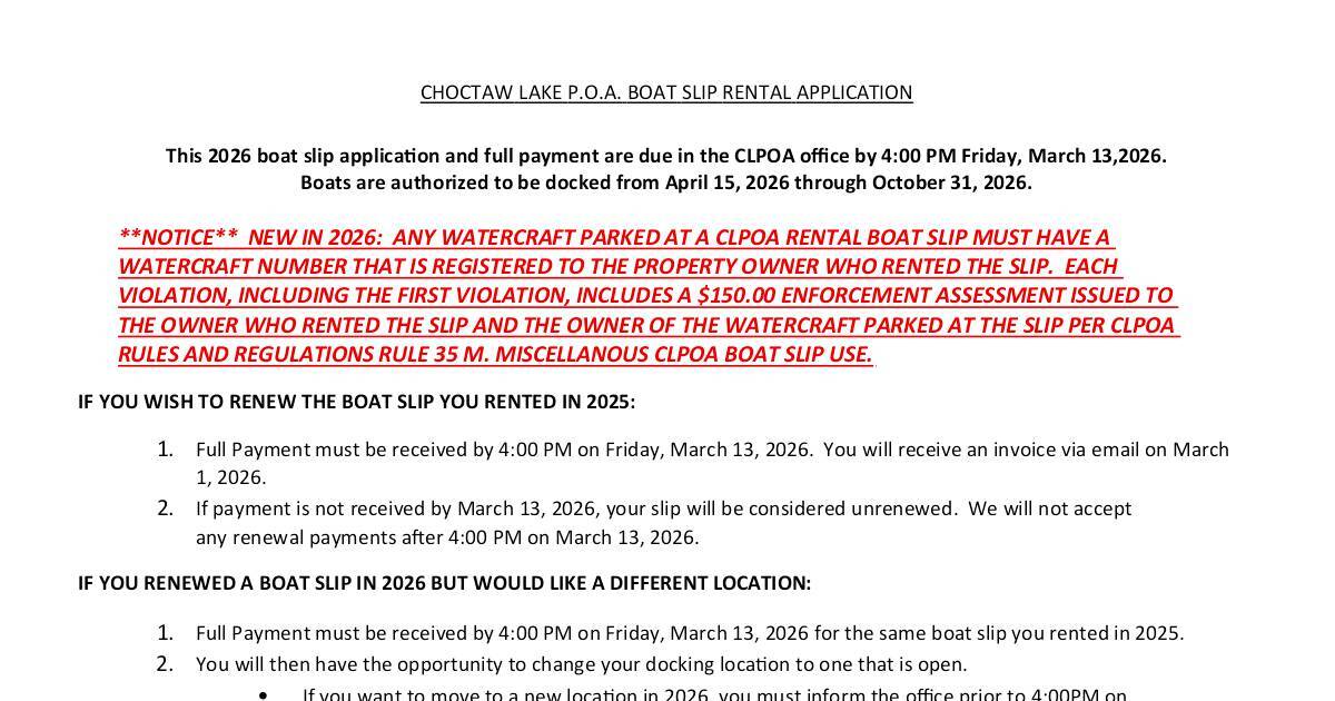 This 2026 boat slip applicaon and full payment are due in the CLPOA office by 4:00 PM Friday, March 13,2026.