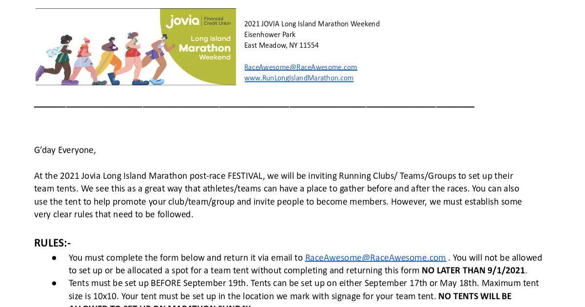 At the 2021 Jovia Long Island Marathon post-race FESTIVAL, we will be inviting Running Clubs/ Teams/Groups to set up their