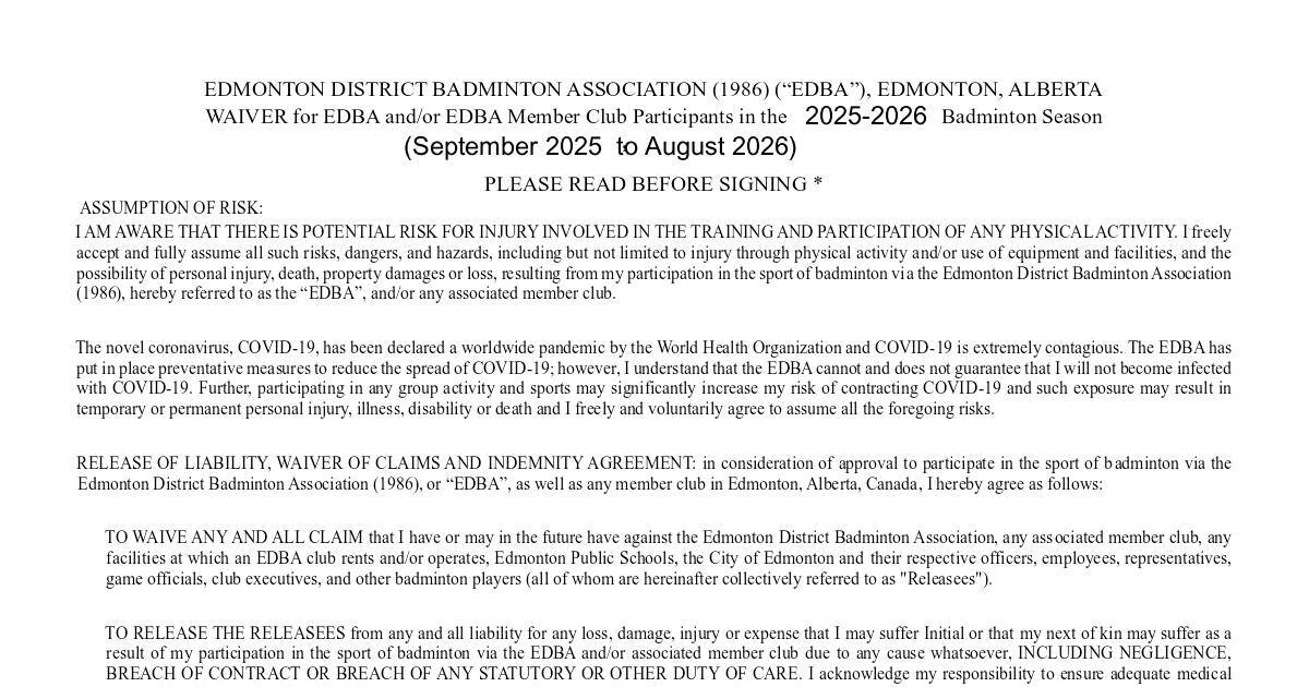 Edmonton District Badminton Association (1986), or “EDBA”, as well as any member club in Edmonton, Alberta, Canada, I hereby agree as follows: