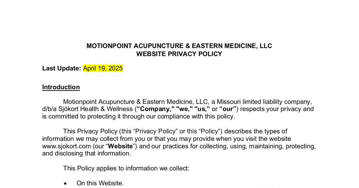 d/b/a Sjökort Health & Wellness (“Company," "we," "us,” or “our”) respects your privacy and