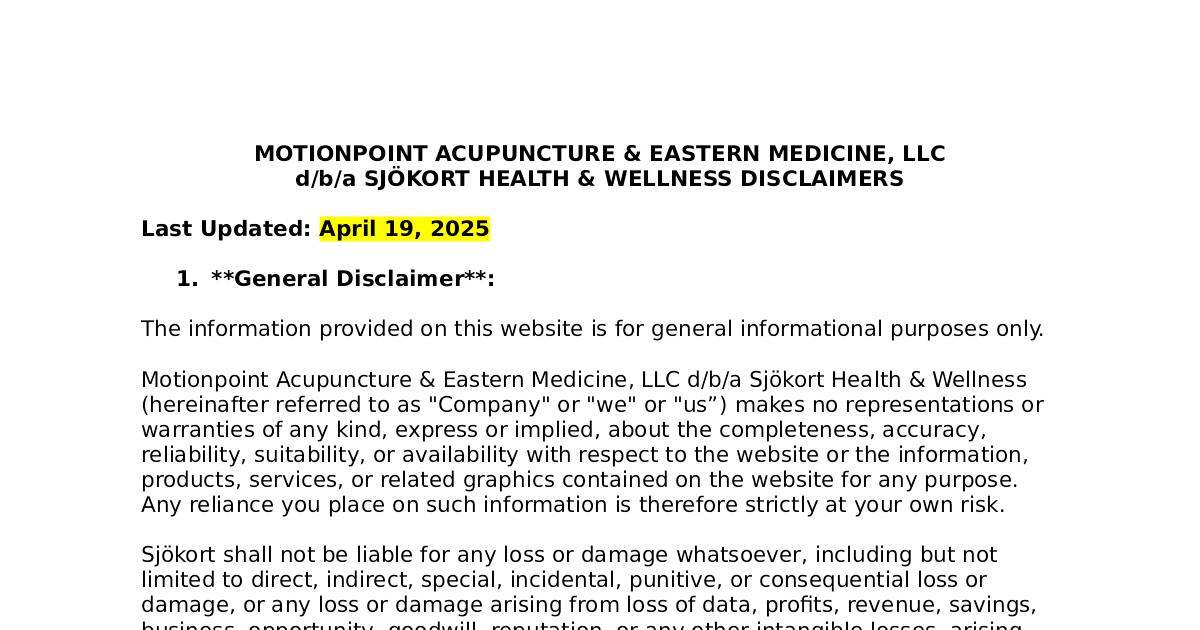 d/b/a SJÖKORT HEALTH & WELLNESS DISCLAIMERS