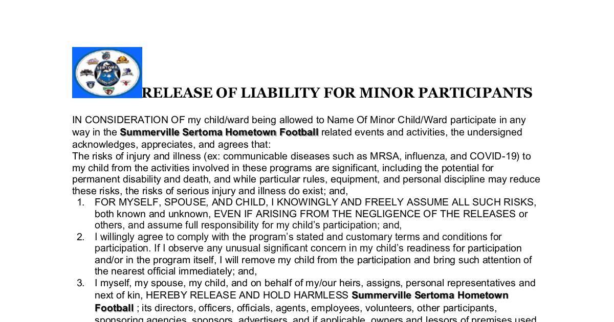 way in the Summerville Sertoma Hometown Football related events and activities, the undersigned