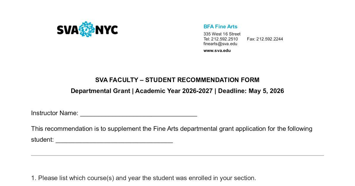 SVA FACULTY – STUDENT RECOMMENDATION FORM