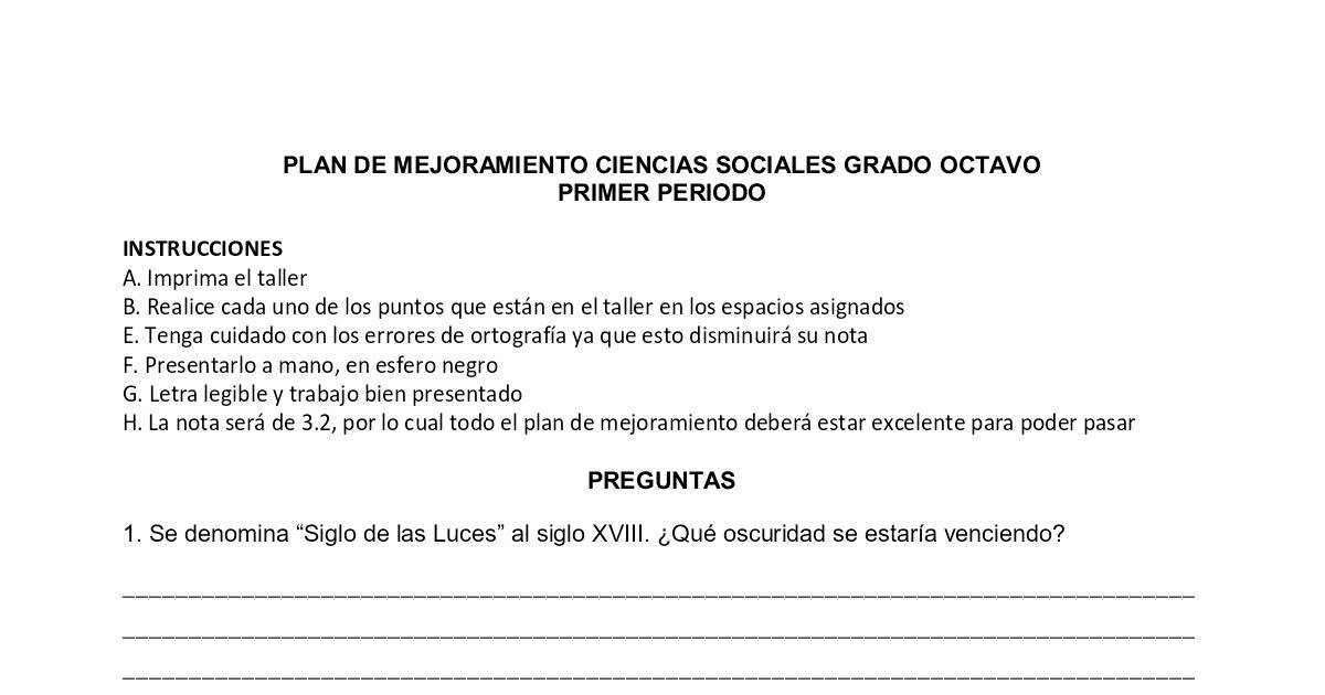 PLAN DE MEJORAMIENTO CIENCIAS SOCIALES GRADO OCTAVO